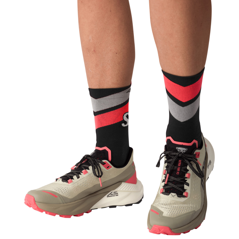 Bežecké ponožky Dynafit ULTRA CREW sú určené pre trail running, dlhé vzdialenosti a intenzívny tréning v náročných podmienkach. Konštrukcia využíva kombináciu nylonu a polypropylénu, ktorá podporuje efektívny odvod vlhkosti a udržuje stabilnú mikroklímu chodidla aj pri vysokej záťaži. Strategicky rozmiestnené zóny tlmenia pomáhajú absorbovať nárazy a znižujú zaťaženie pri dopadoch, zatiaľ čo integrované mesh panely zvyšujú priedušnosť v kľúčových oblastiach.