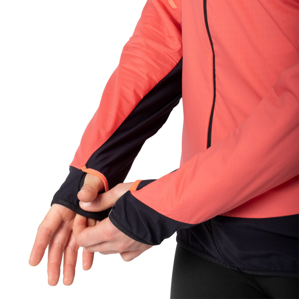 Bunda má priliehavý strih a pružné vložky, vďaka ktorým perfektne sedí aj počas dynamického pohybu. Dve zipsové predné vrecká pojmú drobnosti, ktoré chcete mať po ruke, a priliehavá kapucňa spolu s otvormi na palce dopĺňajú technicky premyslený celok. Táto bunda je ideálnym parťákom na tréning, rýchly pohyb aj závodné nasadenie.