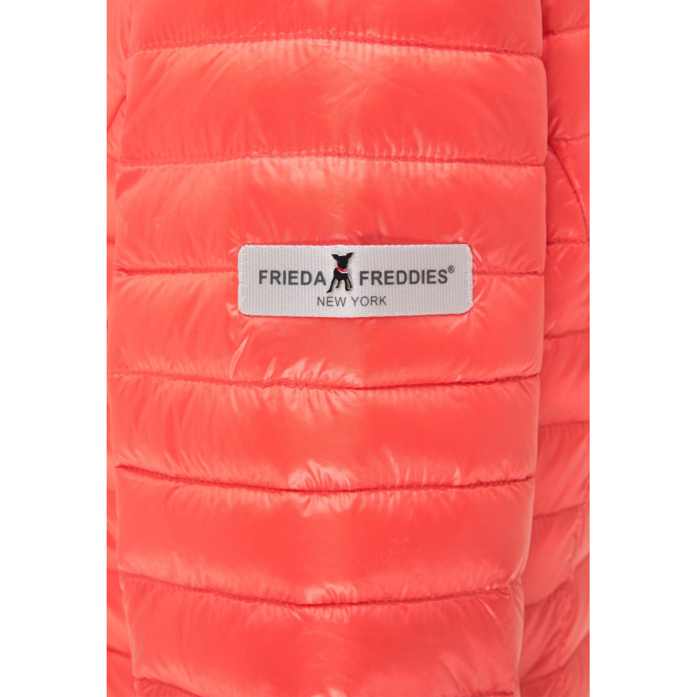 Dámska jarná bunda, ktorá rozžiari každý Váš deň. Bunda je pestrej ružovej farby a má jemné prešitie po celej dĺžke. Okolo zipsu, rukávov a kapucne je šedé prešitie s nápisom Frieda&Freddies. Výroba bundy je tiež šetrná k životnému prostrediu. Zapínanie na zips lemuje aj kapucňu. Na ramene je šedá nášivka s logom značky.
