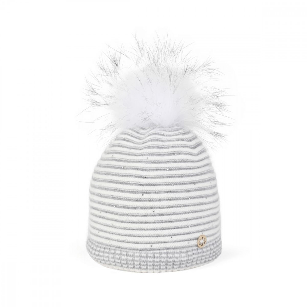Dámska čiapka je doplnená pruhovaným vzorom, ktorý je vyplnený kamienkami od Swarovski. Eleganciu podčiarkuje kožušinová odnímateľná brmbolca. Spodný lem je rebrovaný. Na prednej strane je kovové logo značky. Na vnútornej strane je zateplená fleecovou podšívkou.