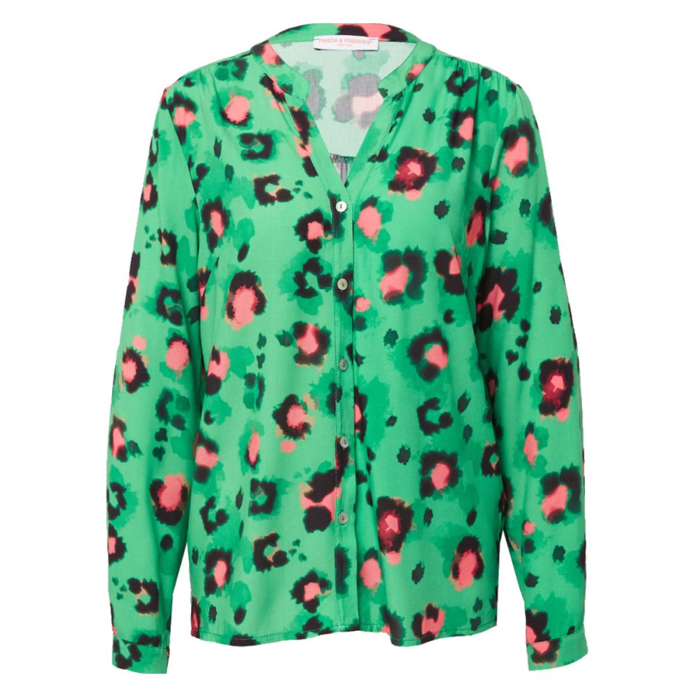 Také košele milujeme: Zelená leopardia potlač, jednoduchý výstrih do V, zapínanie na gombíky a farba, ktorá upúta všetky oči. Dámska ľahká košeľa značky FRIEDA & FREDDIES má všetko, po čom vaše srdce túži.