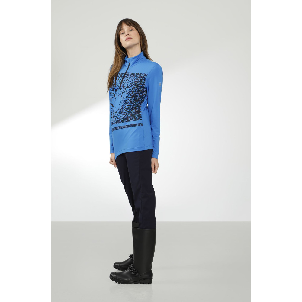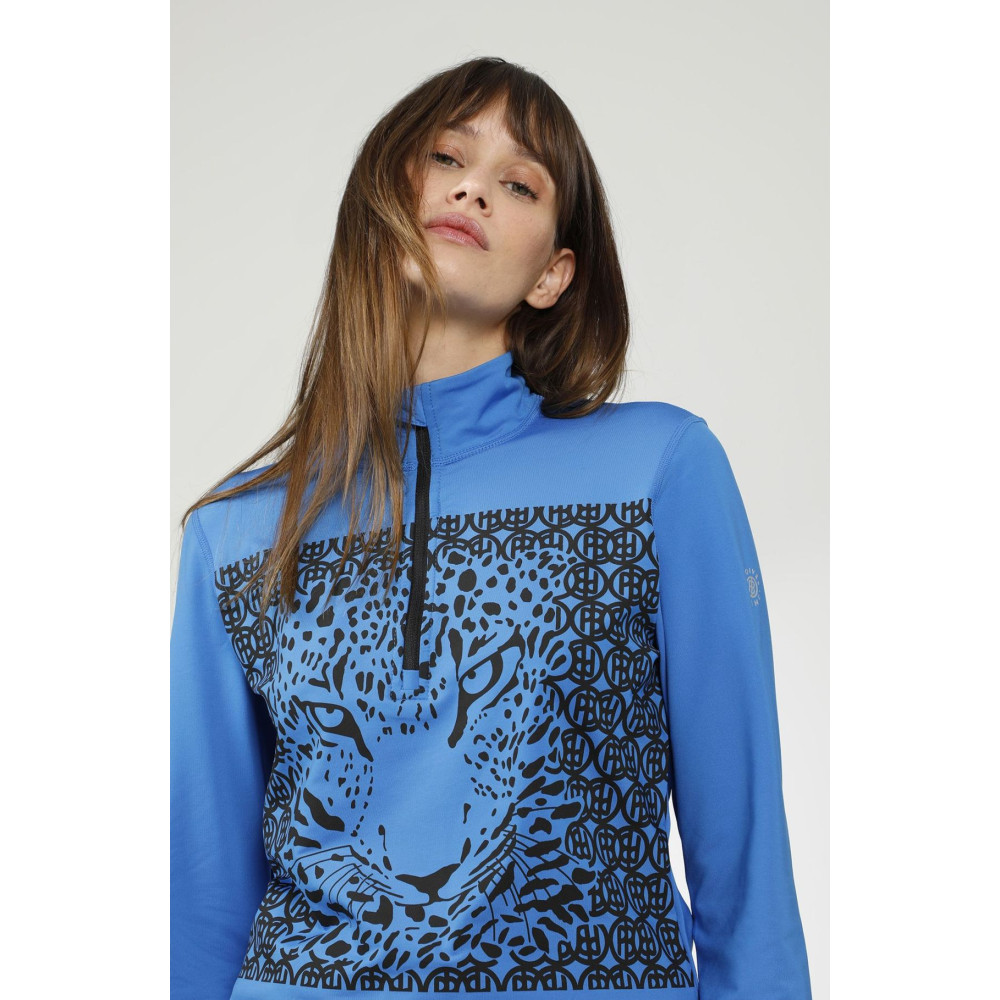Mikina je z tenkého elastického materiálu, ktorý sa krásne prispôsobí postave a zároveň je rýchloschnúci, priedušný a má antibakteriálne účinky. Modrá mikina je ozvláštnená veľkým čiernym obrazom leoparda na hrudníku a malými logami Poivre Blanc. Mikina má vyvýšený stojačik a zapínanie na poloprepínací zips.