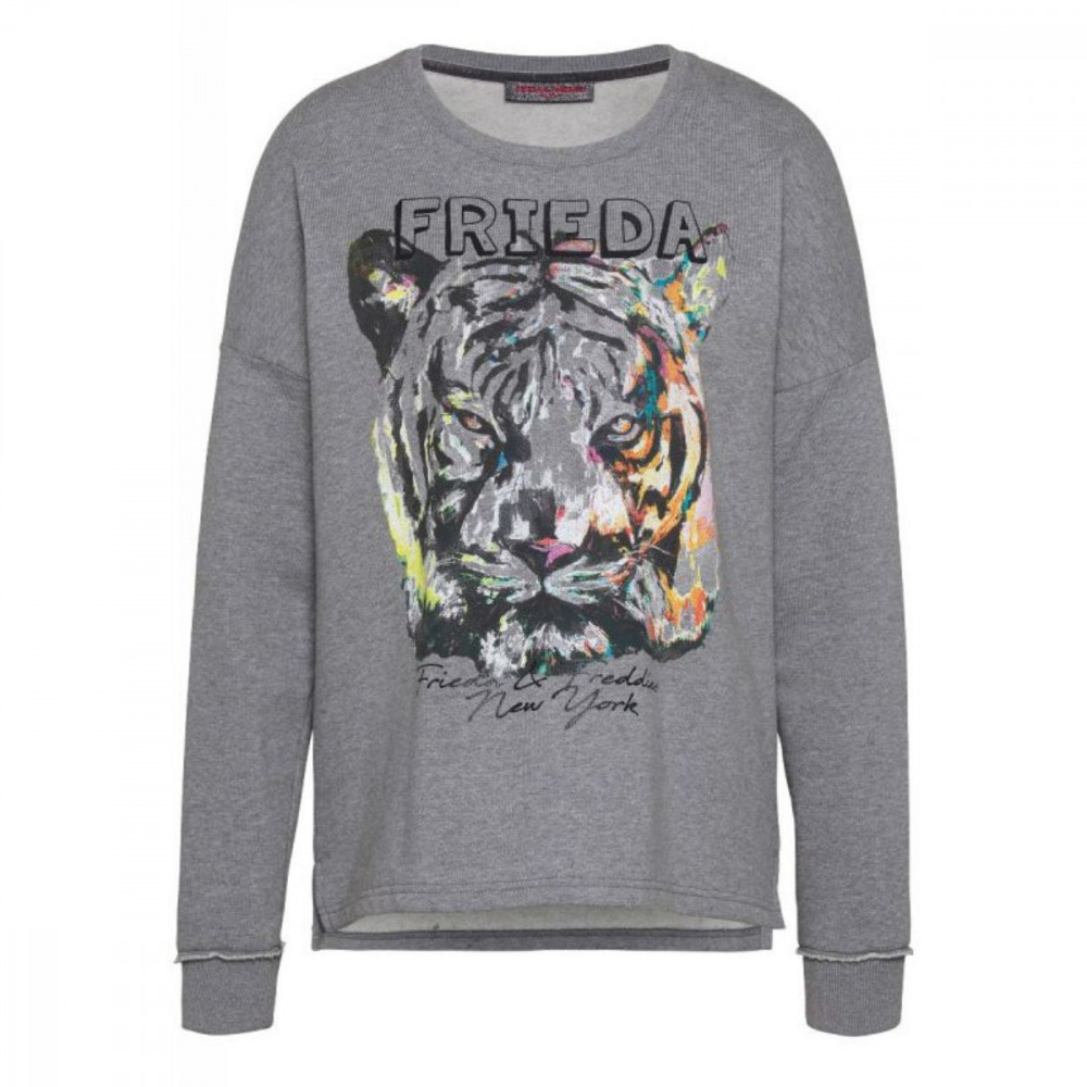 Dámska mikina s tigrou hlavou v modernom akvareli zdobí celok tejto mikiny. Šedá mikina plná farieb je do pásu, na dolnom leme sa nachádza rozparok, ktorý zvýrazňuje dĺžkový rozdiel medzi prednou a zadnou časťou mikiny. Na rukávoch sa nachádza detail, ktorý vytvára dojem odstrihnutej látky.