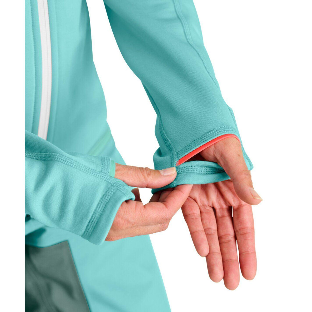 Dámska funkčná mikina, vyrobená z recyklovaných materiálov, je vhodná na všetky športové aktivity i každodenné nosenie. Na vonkajšej strane je použitý recyklovaný polyester, ktorý zaisťuje vyššiu odolnosť, zatiaľ čo vnútorná strana je vyrobená z kvalitnej tasmánskej merino vlny pre optimálny komfort. Rukávy sú zakončené otvormi na palce.