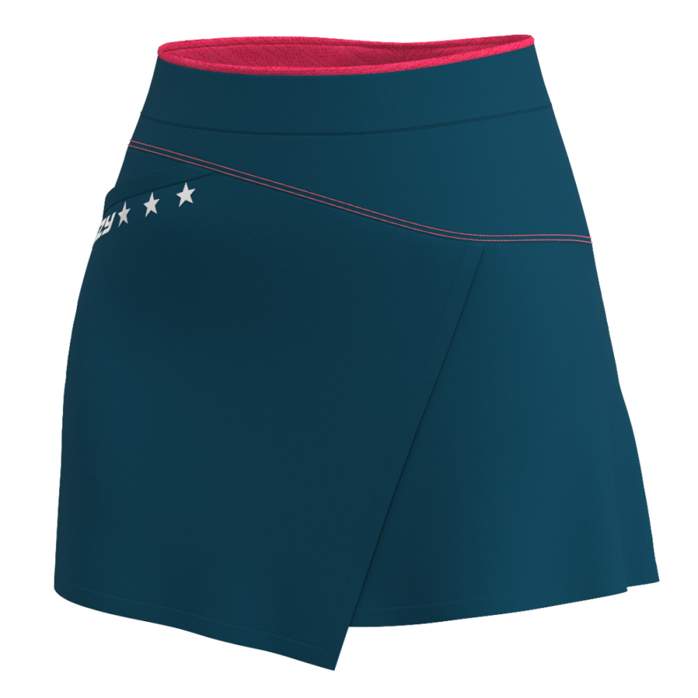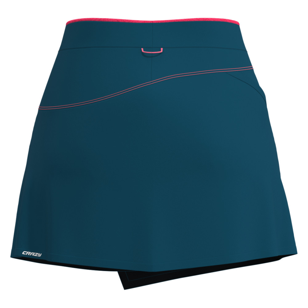 Dámska sukňa Crazy Exit Skirt predstavuje jedinečné prepojenie technického materiálu vhodného na horské aktivity s módnym štýlom, ktorý podčiarkuje originálny zavinovací strih – v outdoorovom oblečení úplne výnimočný. Vonkajšia tkanina je príjemne chladivá, elastická a zaisťuje maximálnu voľnosť pohybu aj pri intenzívnej aktivite. Lepené lemy zaistia aby nedošlo k podráždeniu pokožky. Funkčnosť sukne podčiarkujú vnútorné šortky Revolutional Slim talianskej výroby, ktoré sú známe svojimi mikromasážnymi vlastnosťami podporujúcimi krvný obeh. Elastický pás sa prispôsobí postave, zatiaľ čo kontrastné prešitie a reflexné prvky dodávajú sukni moderný športový charakter. Jedno vrecko na boku zakončené elastickým lemom je praktické na drobnosti ktoré potrebujete mať stále poruke.