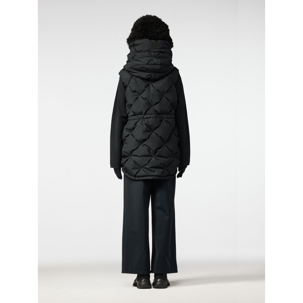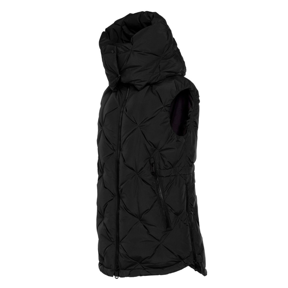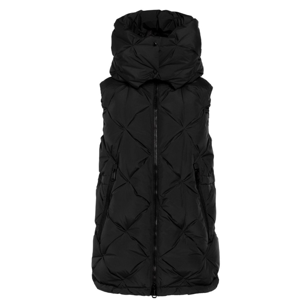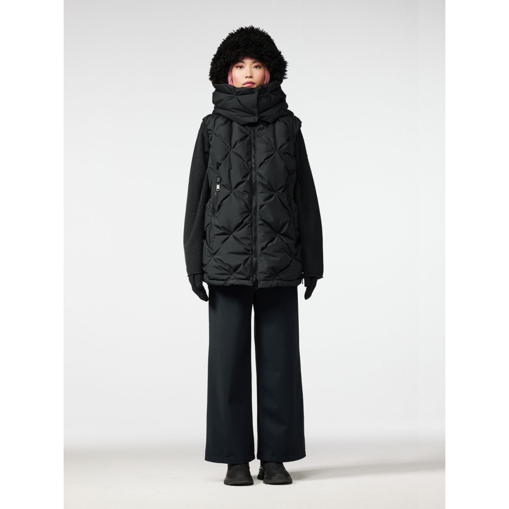 Vesta má voľnejší strih a zadný diel je mierne predĺžený. Vesta má vyvýšený stojačik, ktorý sa dá prekryť chlopňou a pripnúť pomocou cvokov. Na kapucni je plastické logo značky.