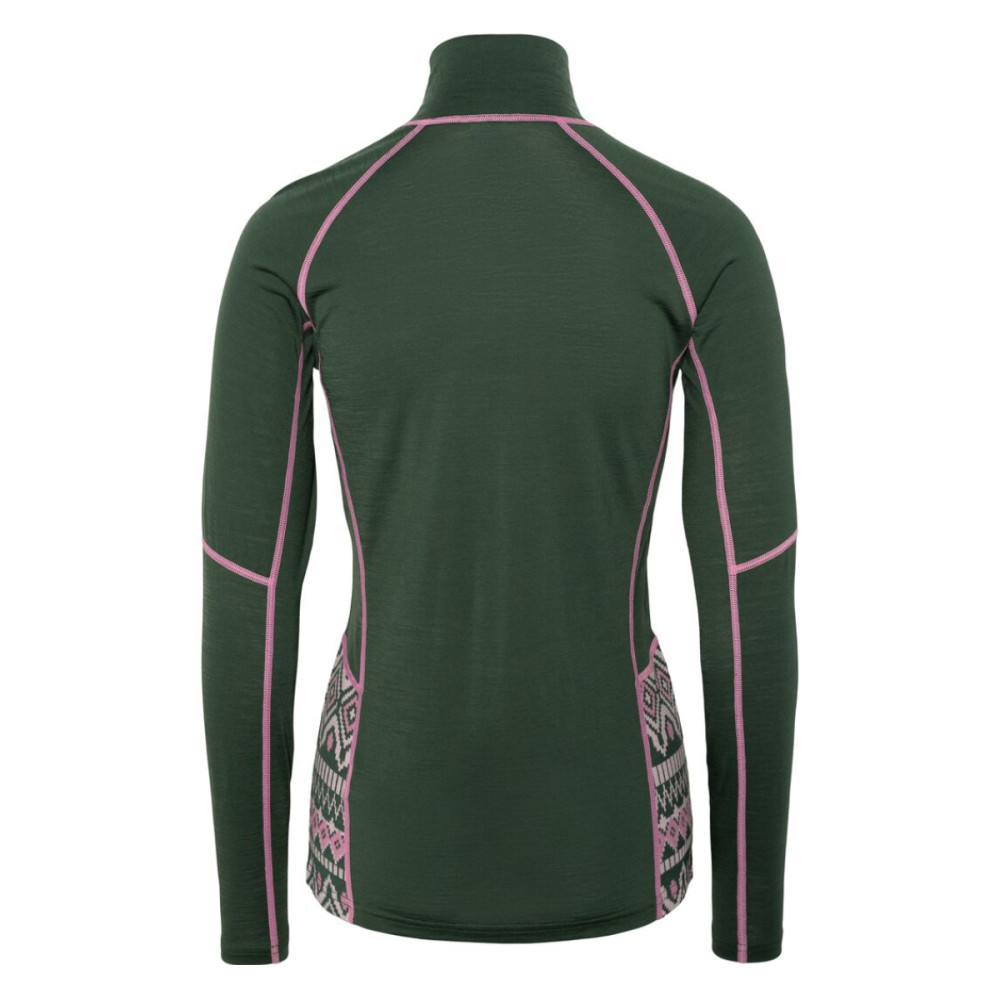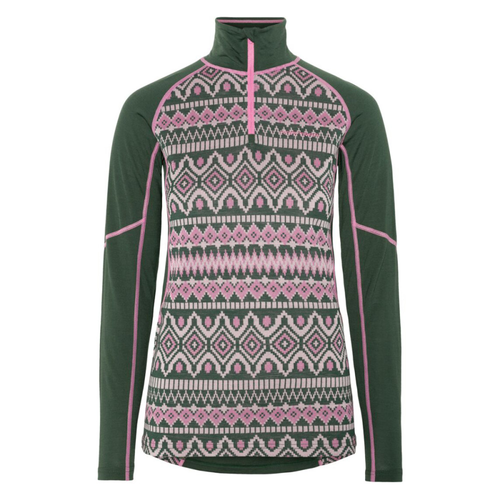 Prednú časť tvorí žakárový úplet s výrazným nórskym vzorom, zatiaľ čo jednofarebné zadné, bočné a rukávové panely z ľahšej zmesi pomáhajú rýchlejšie regulovať teplotu pri vyššej záťaži. Vysoký golier s poloprepínacím zipsom uľahčuje vetranie aj vrstvenie. Ploché švy minimalizujú trenie a úzky strih zaisťuje, že tričko dobre sedí pod strednou a vrchnou vrstvou.