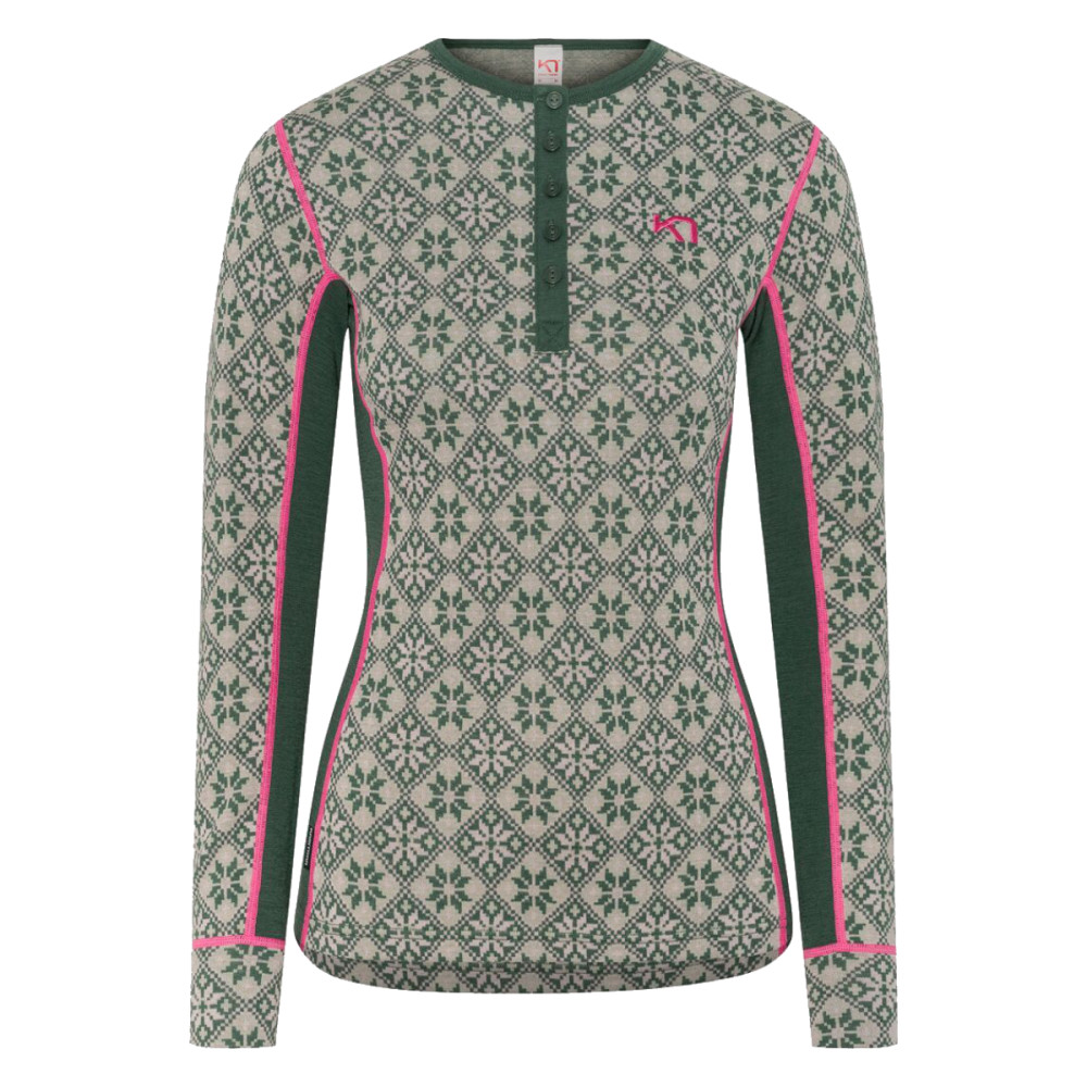 Dámske vlnené tričko s dlhým rukávom Kari Traa ROSE LS je základná vrstva zo 100% merino vlny, ktorá poskytuje spoľahlivú tepelnú reguláciu v zimných podmienkach. Jemná merino vlna hreje aj vo vlhku, odvádza vlhkosť od pokožky a udržuje príjemnú mikroklímu pri rôznych intenzitách pohybu. Priliehavý strih a pružné panely v podpazuší podporujú voľnosť pohybu, žakárový úplet potom zvyšuje odolnosť materiálu. Okrúhly výstrih s légou a gombíkmi umožňuje ľahké vrstvenie a lepšiu kontrolu tepelného komfortu.