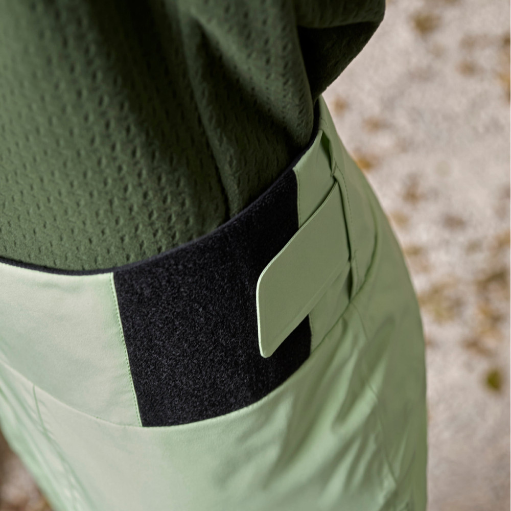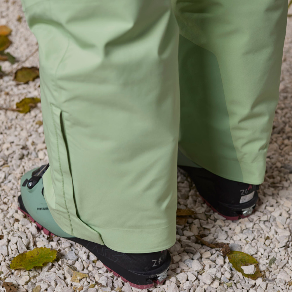 Nohavice majú ležérnejší freeridový strih a extra vysoký pás, ktorý poskytuje lepšie krytie chrbta a vyšší komfort pri jazde aj pri sedení na lanovke. Nastaviteľný pás, bočné ventilačné zipsy a anatomicky tvarované kolená podporujú voľnosť pohybu a umožňujú jednoduchú reguláciu teploty pri vyššej fyzickej záťaži. Vnútorné snehové gamaše spoľahlivo zabránia prenikaniu snehu do topánok, zatiaľ čo zosilnené časti v oblasti členkov chránia materiál pred poškodením hranami lyží alebo mačkami.