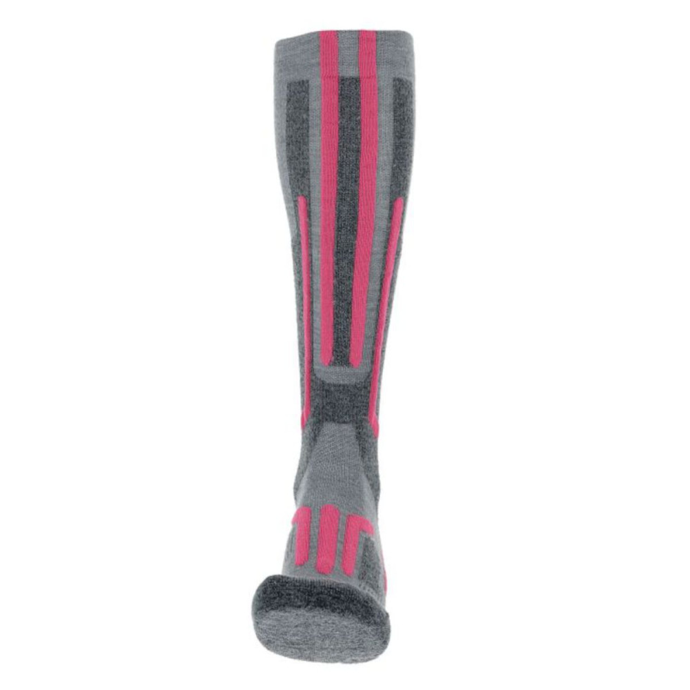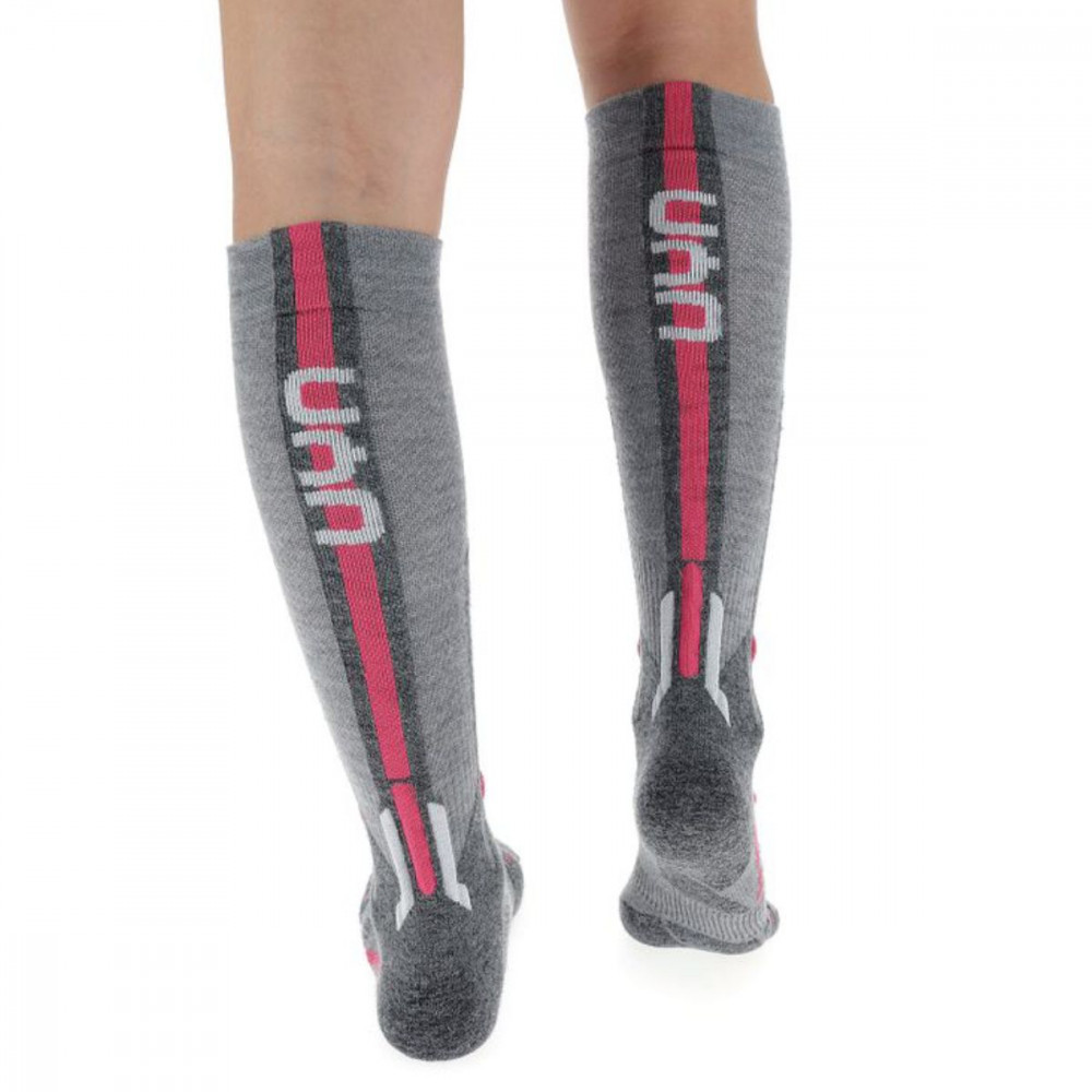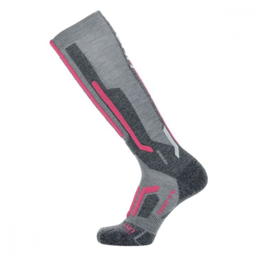 Dámske funkčné ponožky UYN Ski Merino sú výkonný model vyrobený z vlny Merino, prirodzene izolujúce a proti zápachu. Vďaka výrobnej technike exkluzívnej UYN je vlna Merino kombinovaná s priadzou FIBRESIST, ktorá zaisťuje vyššiu odolnosť. Trojrozmerné ochrany v strategických oblastiach hornej časti, holene, členku a Achillovej šľachy tlmia nárazy do topánky a ergonomický dizajn umožňuje, aby sa ponožka obopínala okolo chodidla a prispôsobila sa každému pohybu bez nepohodlia a oderu.