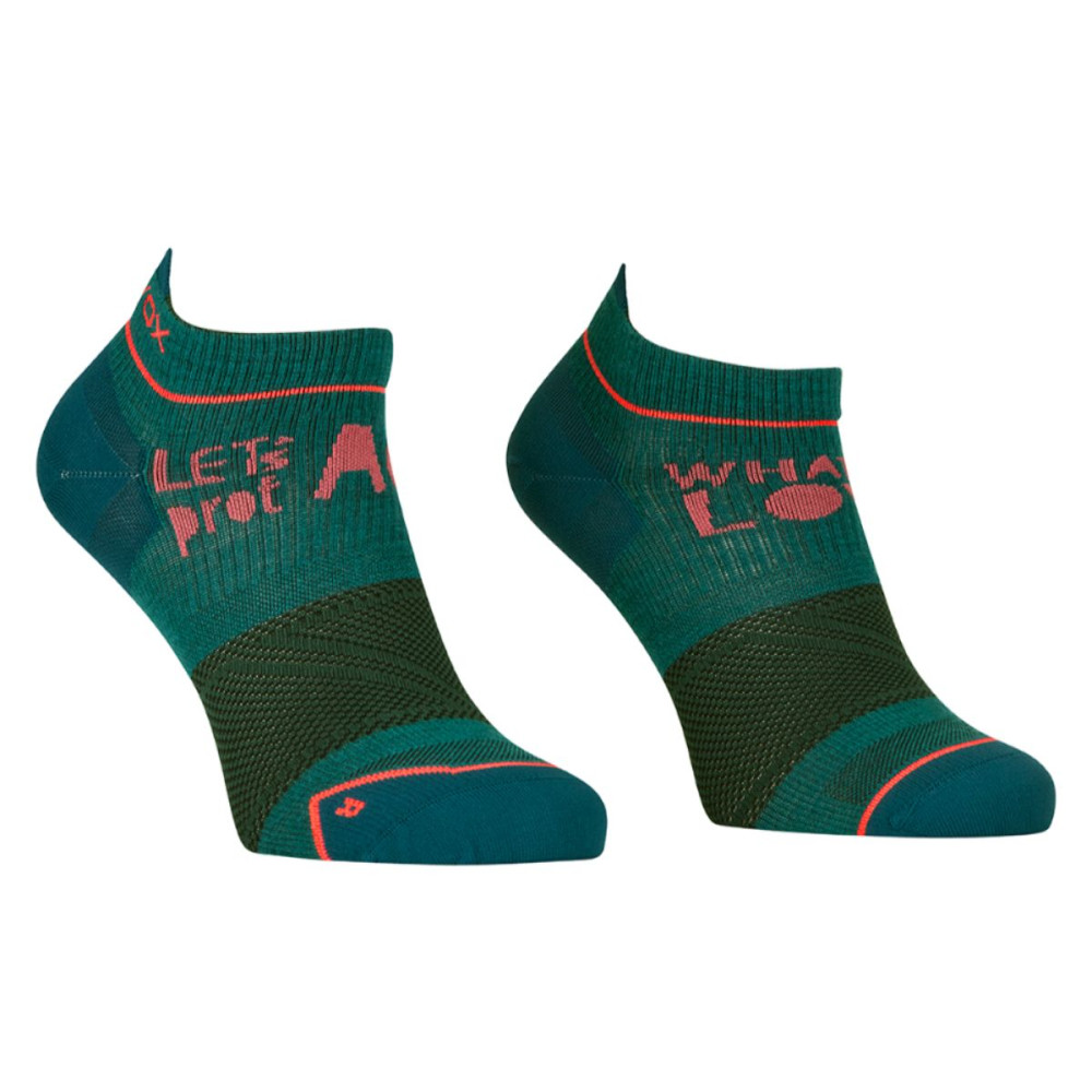 Dámske členkové ponožky ORTOVOX ALPINE LIGHT LOW SOCKS sú ideálnym spoločníkom na dlhé letné dni v prírode. Sú pletené zo zmesi merino vlny a syntetiky. Vďaka tomu sú veľmi odolné, príjemné a funkčné. Vlna výborne absorbuje vlhkosť do svojho jadra a skvele dýcha. Navyše je prirodzene antibakteriálna a je schopná neutralizovať pachy. Polyamidové vlákna zvyšujú odolnosť aj životnosť ponožiek. Ponožky sú vyrobené bezšvovou technológiou pletenia, to znamená že sú pletené do kruhu, vďaka čomu vás v topánkach nič netlačí.