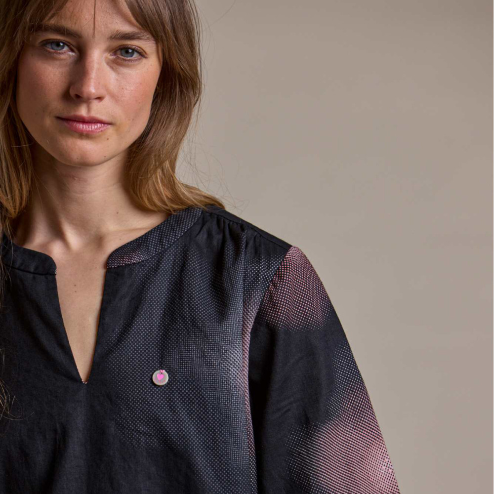 V-výstrih so stojačikovým golierom dodáva siluete jemnú eleganciu, volánikové detaily na ramenách pridávajú ženský nádych a mäkké záhyby vzadu vytvárajú splývavú, ľahkú líniu. Prírodný gombík z orecha tagua je nenápadným, ale vedomým detailom, ktorý dotvára celkový charakter šiat.