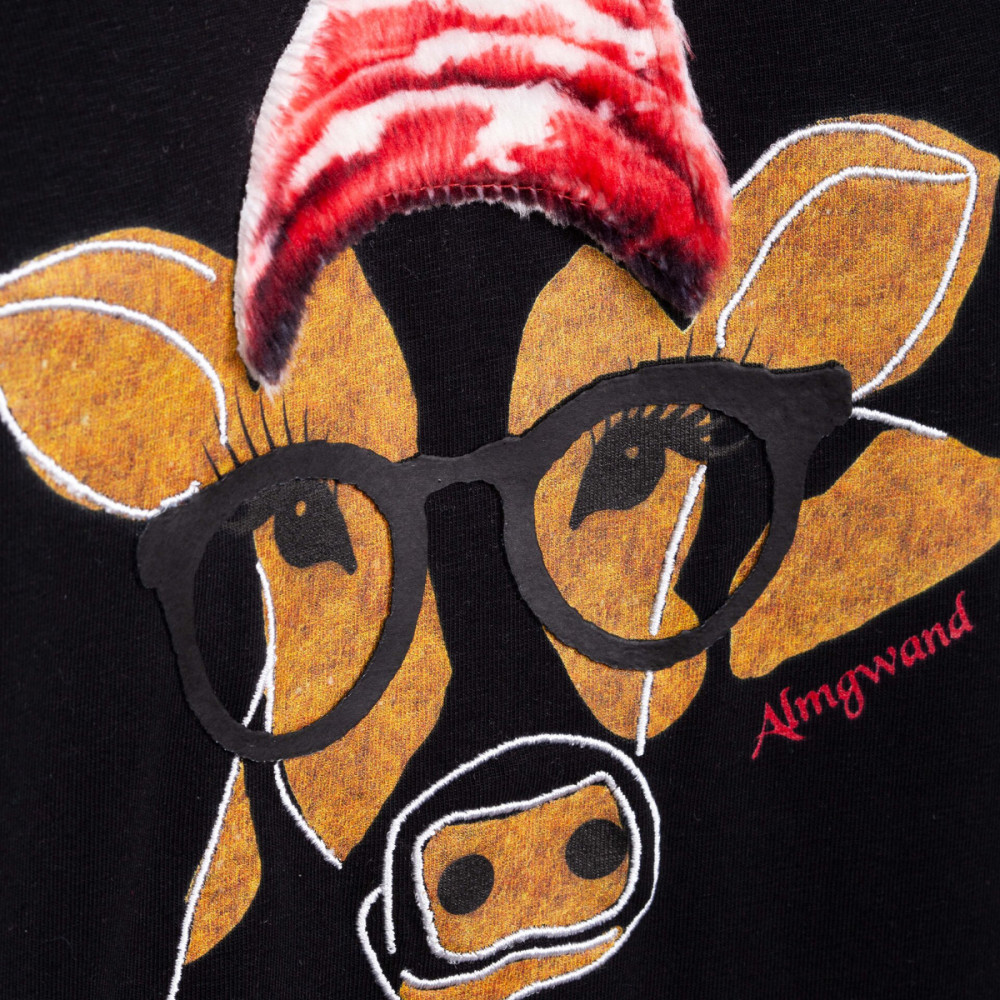 Vďaka vysokému podielu bavlny je tričko veľmi mäkké a hebké na dotyk, takže sa v ňom budete cítiť skvele po celý deň. Ale toto tričko nie je len o pohodlí - jeho jedinečný dizajn z neho robí skutočný módny skvost. Na hrudníku nájdete roztomilý motív kravy s vyšitou červenou čiapkou a okuliarmi, ktorý dodáva tričku hravý a nezameniteľný vzhľad. Na rukáve trička je umiestnená štýlová nášivka v tvare erbu s logom značky Almgwand.