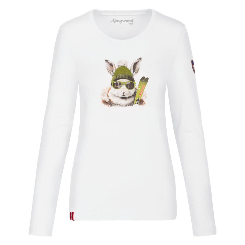 Tričko zaujme svojim jedinečným dizajnom, ktorý zdobí roztomilý motív králika lyžiara s vyšitou zelenou čiapkou. Tento detail dodá vášmu outfitu šmrnc a osobitosť. Nášivka erbu na ramene je symbolom originality a kvality, ktorú značka Almgwand garantuje.