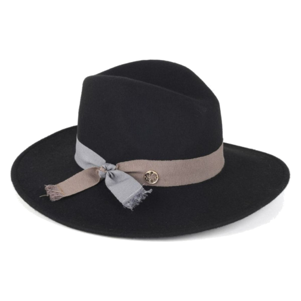 Oživte svoj outfit s nestarnúcim klobúkom! Čierny klobúk je doplnený hnedo-modrou mašľou so zlatým logom značky. Na vnútornej strane po obvode je elastická guma. Vďaka pevnému materiálu drží klobúk svoj tvar. Klobúk má celoročné využitie a dá sa kombinovať s akýmkoľvek outfitom.