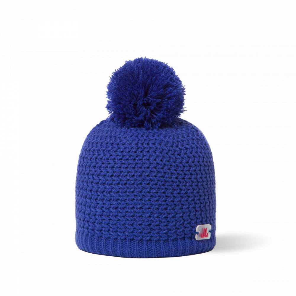Detská pletená čiapka v modrej farbe, doplnená módnym brmbolcom. Má rebrovaný lem. Na prednej strane má logo značky. Na vnútornej strane je zateplená fleecom.