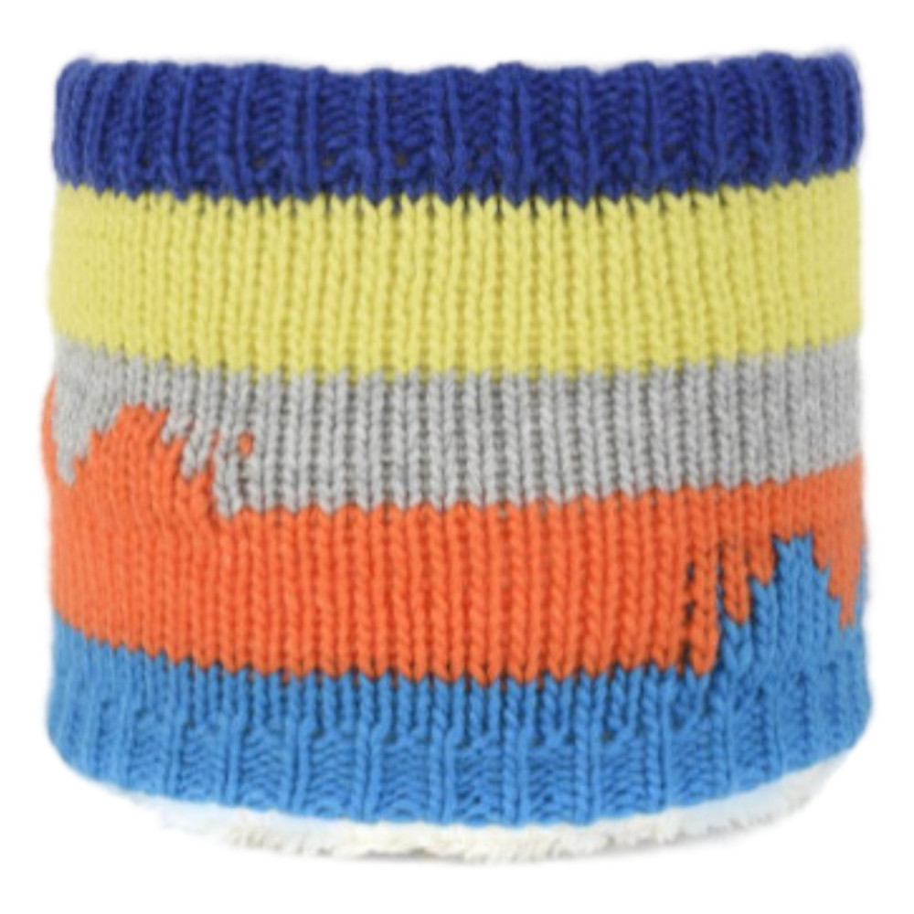 Detský pletený nákrčník vo farebnom prevedení, vyniká pruhovaným vzorom. Je príjemne hrejivý a to vďaka vnútornému zatepleniu. Na prednej strane má logo značky.