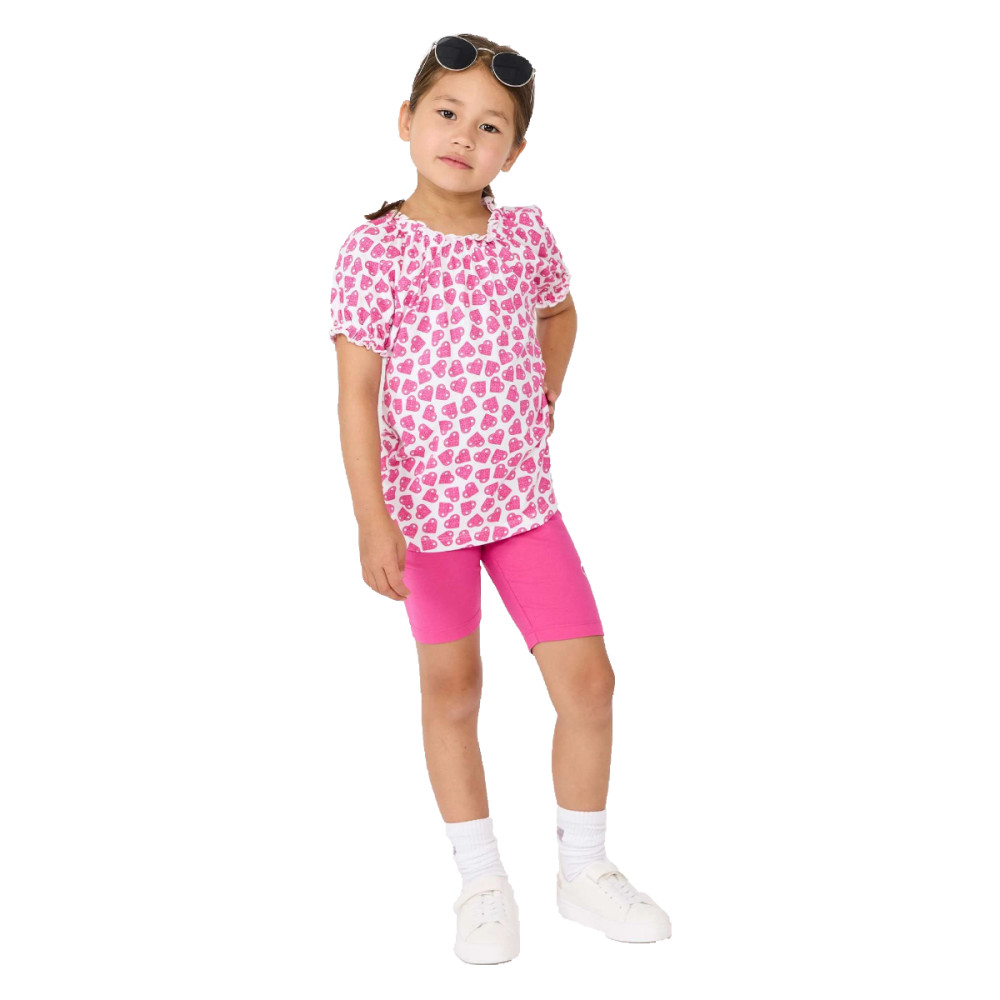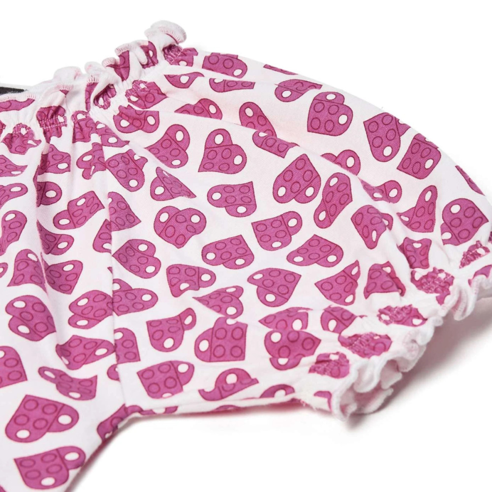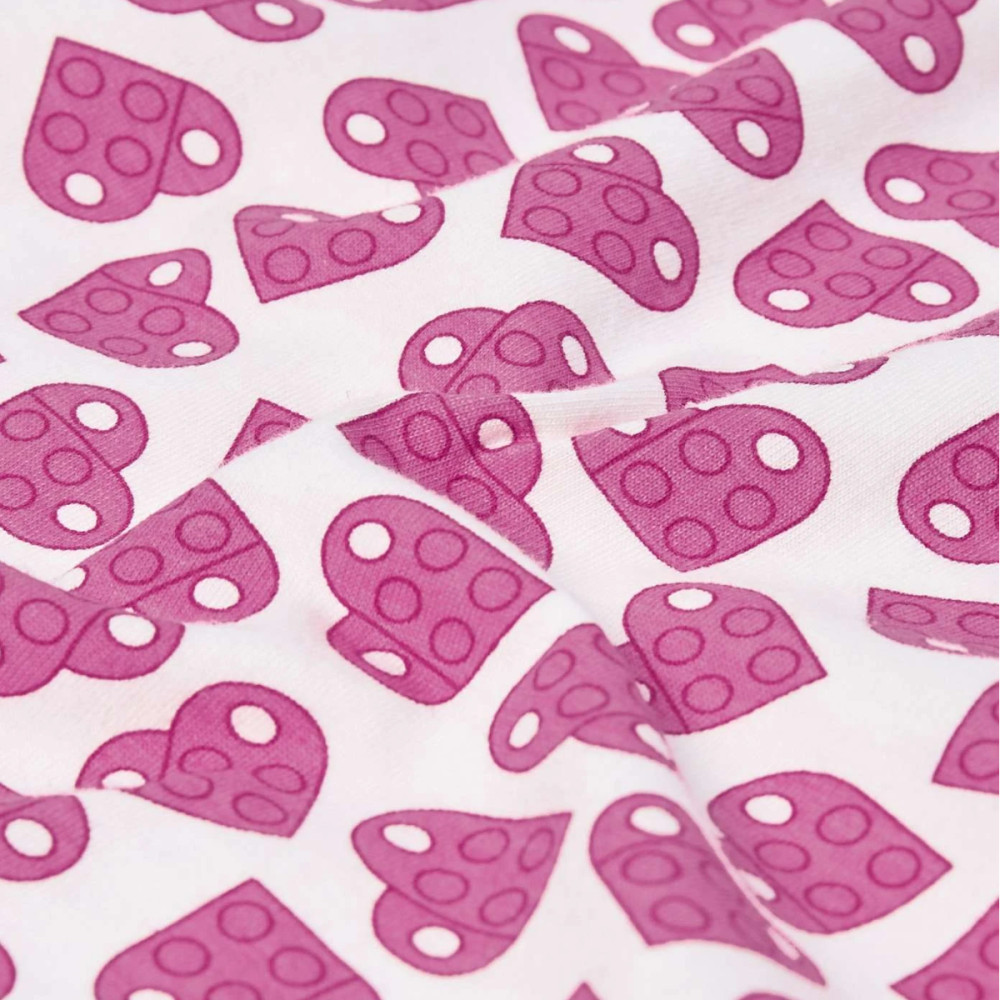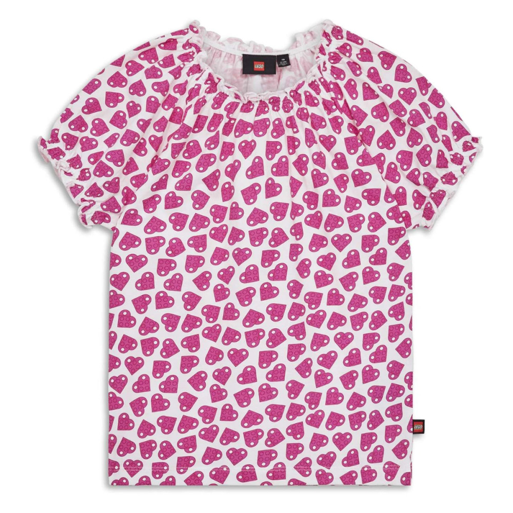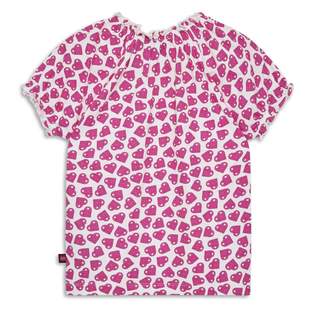 Roztomilé dievčenské tričko Lego Wear LWTAJA 300 s nadýchanými rukávmi je ozdobené krásnou potlačou ružových srdiečok, ktoré pokrývajú celú plochu. Srdiečka sú tvorené dvoma LEGO kockami, ktoré sú umiestnené na sebe, aby vytvorili tvar srdca. Doplnené roztomilými volánikovými detailmi na výstrihu a rukávoch, ktoré pridávajú na jemnosti a hravosti. Vyrobené z ľahkej organickej bavlny, je ideálny pre horúce letné dni, kedy je pohodlie na prvom mieste.