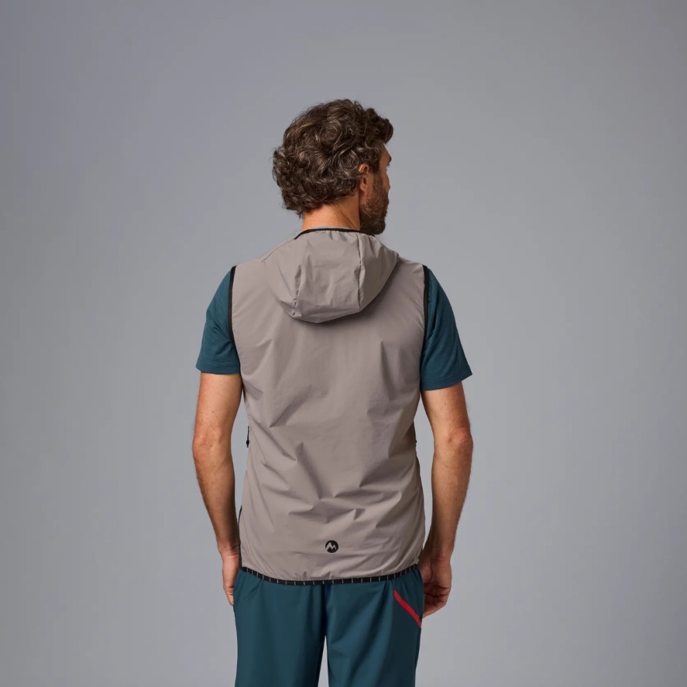 Zadný diel vesty tvorí priedušný a pružný materiál, ktorý sa rýchlo prispôsobí pohybu, odvádza vlhkosť a rýchlo schne. Vďaka elastickému zakončeniu kapucne, prieramkov a spodného lemu, vesta perfektne sedí na tele bez obmedzenia. Nechýbajú dve bočné vrecká a náprsné vrecko na zips, ktoré ponúkajú dostatok priestoru na nevyhnutnosti pri každej túre.