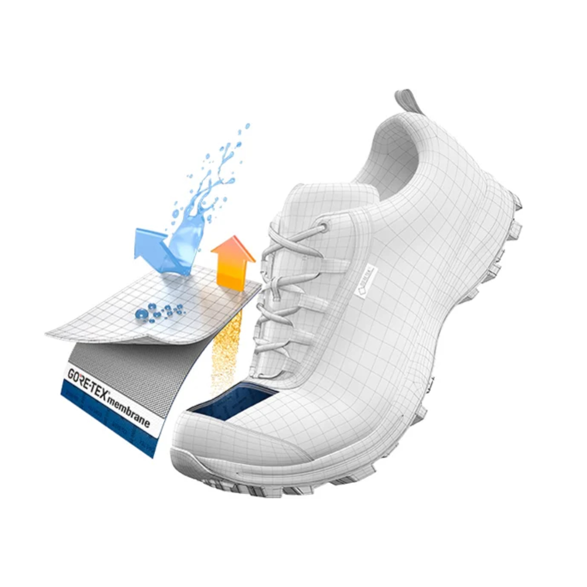 GORE-TEX®Textilné podšívky sa skladajú z niekoľkých vrstiev a jednu z nich predstavuje membrána – spravidla GORE-TEX®. V jej prípade sa na jeden centimeter štvorcový materiálu podarilo zmestiť 1,5 miliardy pórov, ktoré sú 20000krát menšie ako kvapka vody, avšak stále asi 700krát väčšie ako molekula vodnej pary. Vlhkosť zo snehu či premočenej lúky sa teda k nohám nedostane a naopak pot odíde von.